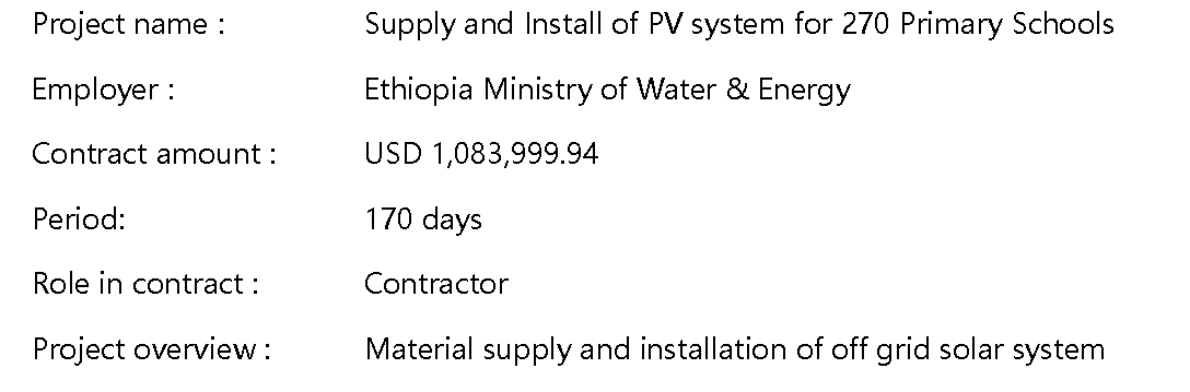 Mashruucu wuxuu bixiyay maalgelin bangiga adduunka sanadkii 2011, dawladda Itoobiya waxay heshay 270 nidaam nidaam jiilaal oo Photoltaic ah ilaa 270 dugsiyo fog. Mashruuca ayaa ujeedadiisu tahay inuu sare u qaado horumarinta tamarta dib loo cusbooneysiin karo ee bulshooyinka reer miyiga ah ee ku yaal Itoobiya, yareynta ku tiirsanaanta dalka ee shidaalka la soo dejiyo, oo yareeyo lagu kontoroolo. Qiiqa gaaska. Shirkaddeenu waxay si guul leh u dhammaystirtay rakibaadda iyo xilka ka mid ah dhammaan nidaamyada waqtiga loo cayimay, oo ay ammaan ku ammaanta kahelaan milkiilayaasha.